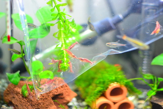 第一週的設缸,原先只有孔雀一尾後加入了玫瑰蝦5支隔一天再加入原有的燈魚10尾沒想到,從此玫瑰蝦開始一天掛一支目前只剩下1支今天再去補蝦原打算先補5支,老闆說買10送2好…就一次帶回1打