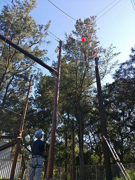 ▼接下來……重頭戲 《信心擊球》爬上10公尺高的木頭圓柱