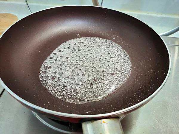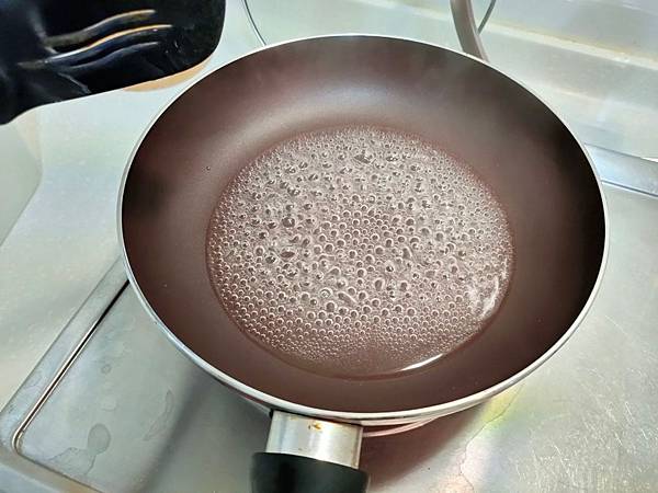 1、放入糖與水,將其煮融,待泡泡由大變小