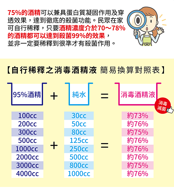 即可調配出濃度70%至78%的酒精